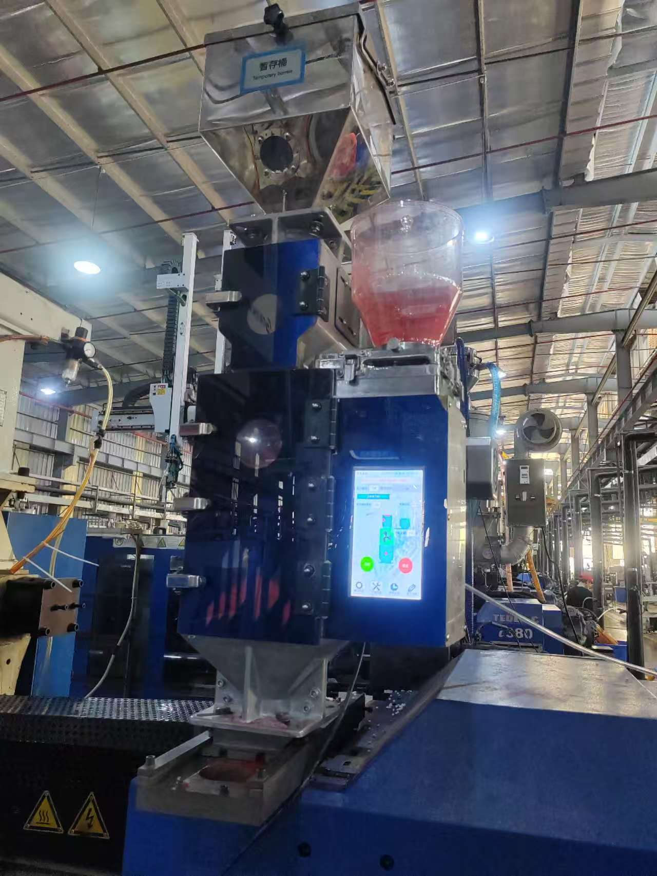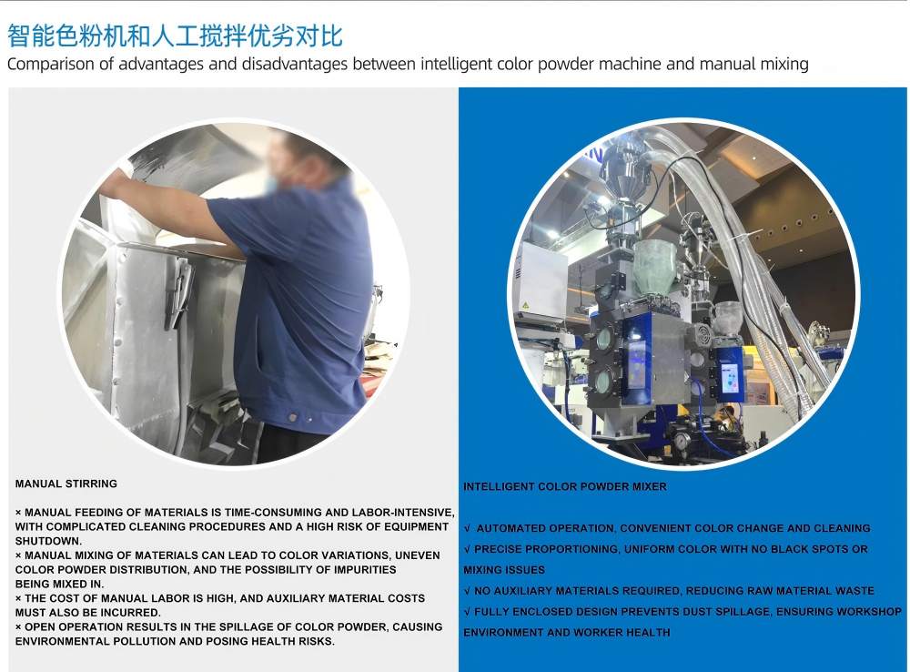 100кг/сағ«Интеллектуалды түсті ұнтақты араластыру» орталықтандырылған азықтандыру жүйелерімен, орталық тасымалдау жүйелерімен және материалды автоматты өңдеу жүйелерімен үздіксіз біріктірілуі мүмкін. Пластикалық түсті араластырғыш араластыру процесінің біркелкілігін және түс консистенциясын қамтамасыз ететін және көп компонентті ұнтақтар мен қоспалардың автоматты пропорциясын қолдайтын жоғары дәлдіктегі таразы датчиктерімен жабдықталған.